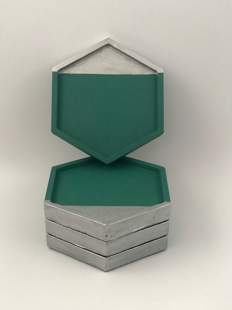 4pcs Hexagon Geometric Emerald Green and Silver Coasters